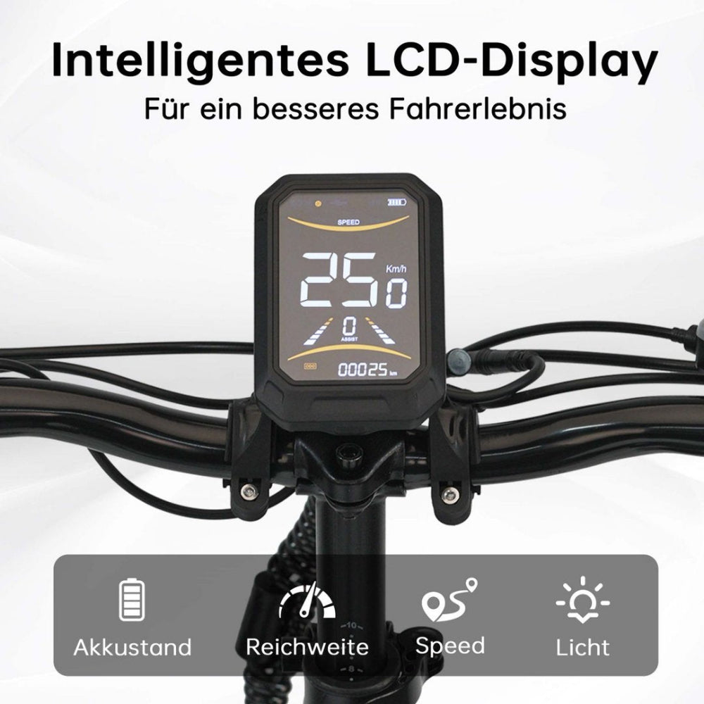 Das Maxtron Polaris ist ein kompaktes Fettreifen-E-Bike mit 250W Bafang-Motor, 48V/13Ah Akku und bis zu 45 km Reichweite. Die 20×4,0" Reifen und Federung sorgen für Komfort in Stadt und Gelände. Mit Shimano 7-Gang-Schaltung, klappbarem Rahmen und stabiler Konstruktion ideal für den täglichen Gebrauch.